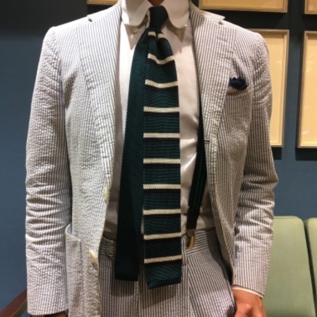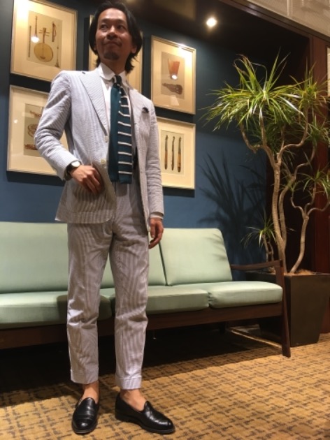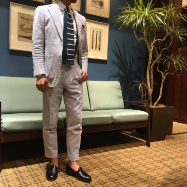 季節感が感じられるシアサッカーのブルーストライプのスーツスタイルです。