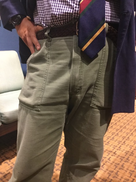 敢えてのブッシュパンツで無骨なアイテムを取り入れたミックススタイル。この組み合わせは個人的にこの秋冬の着こなしに取り入れてみようと只今準備中・・・。