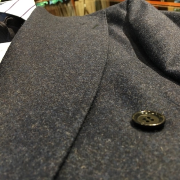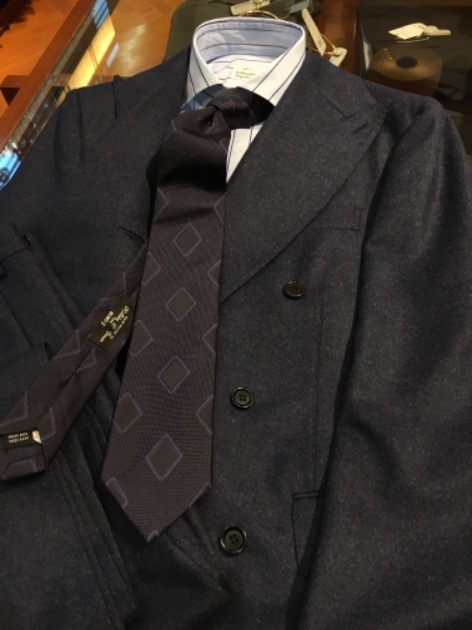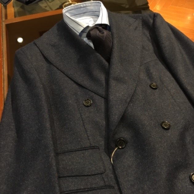 イベント用に入荷したモデルです。ネイビーフランネルのダブルスーツ。