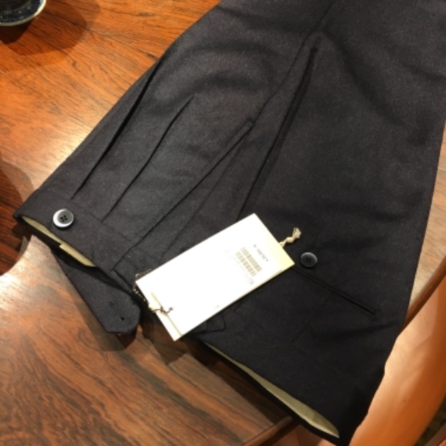 「ボトムは太め」とのリクエストで、おすすめしたのはお馴染みの<GTA(ジーティーアー)>"HERRICK"。ウールフランネルのネイビー。