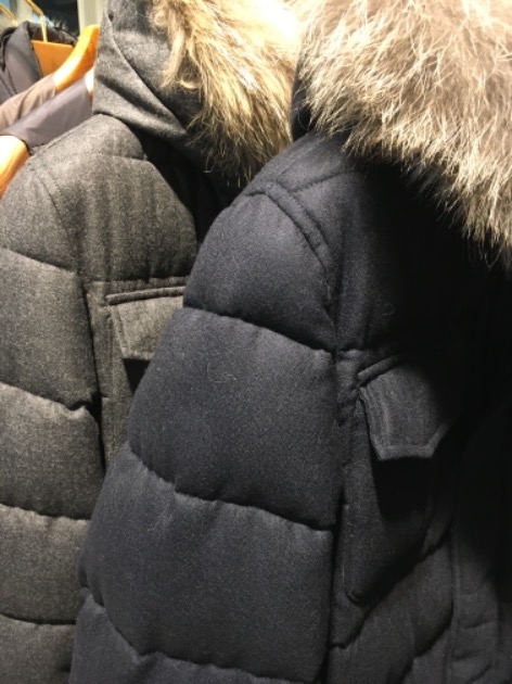 グレイとネイビーの2色です。ベースはベストセラーモデルの4ポケット型。表生地をウールに変更。フードにはデタッチャブルのファーが付いて、中綿はポリエステル。天然のダウンに負けない保温性があるんだそうで。