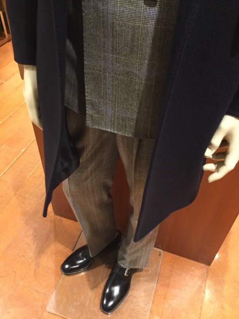 スーツの柄の色を拾ってシャツやタイなどで合わせる事で着こなしにまとまりがでますね。加えて、各アイテムの色味もそれぞれずらしております。
