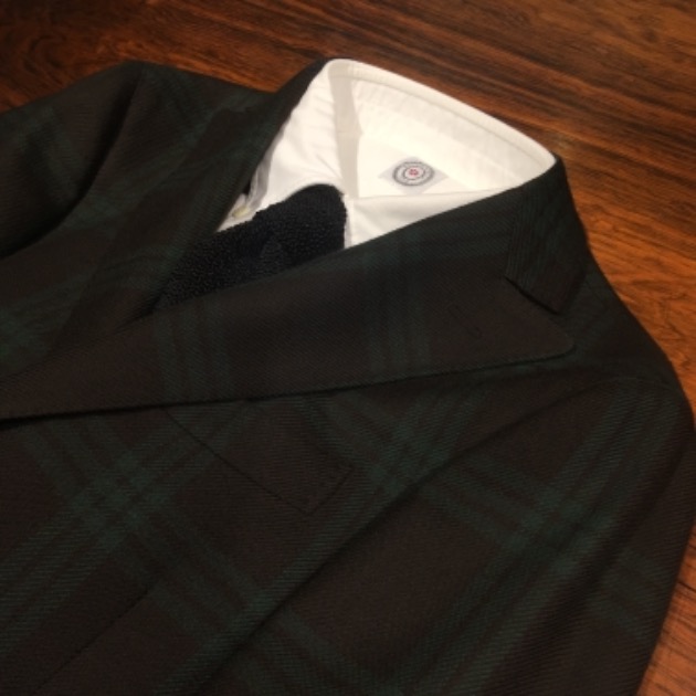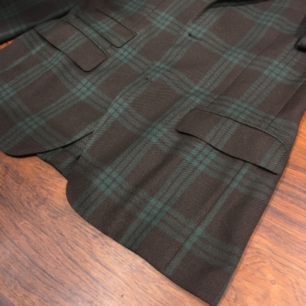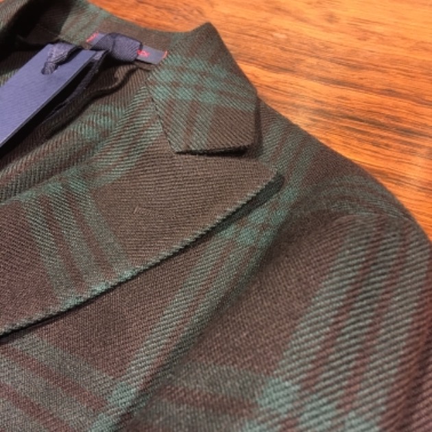 ネイビーベースにピッチが広いグリーンが特徴的な1着となっております。