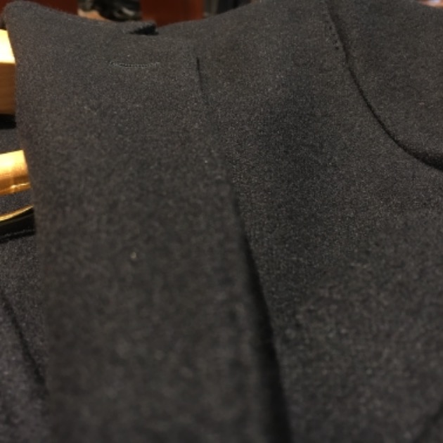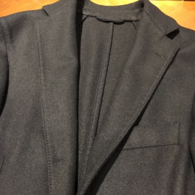 カシミア生地は後染めのネイビー。ミッドナイトネイビーといった感じですね。かなり濃いめのトーンです。