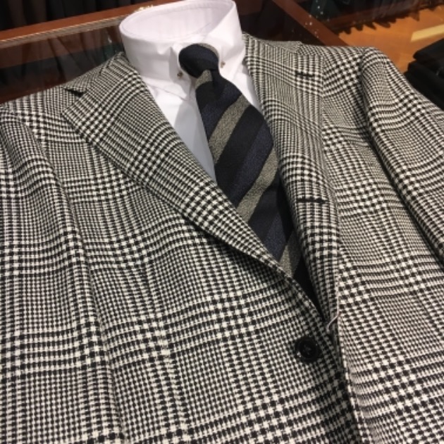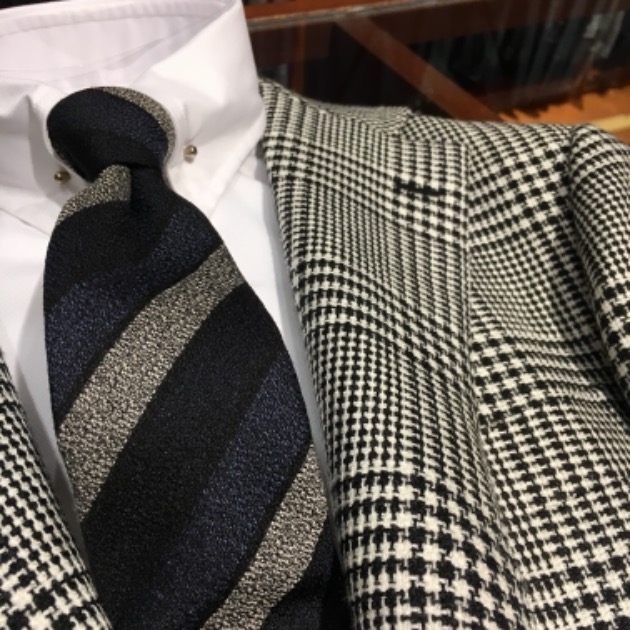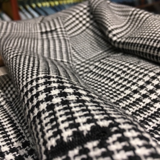 白×黒のシンプルなグレンプレイド。毛足も短め、比較的サラっとした生地感。クールな雰囲気です。