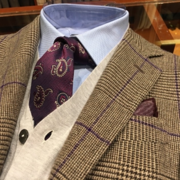 Vゾーンはペーンの色を拾ってシンプルに。ネクタイの柄はもっとシンプルで良かったかも...。