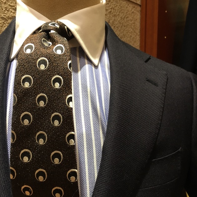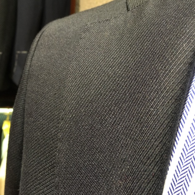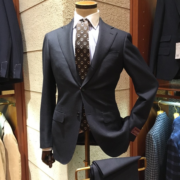 主役のスーツは英国の生地メーカー<BOWER ROEBUCK(バウアーローバック)>のネイビーカルゼ。