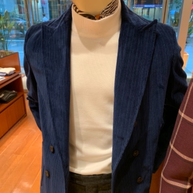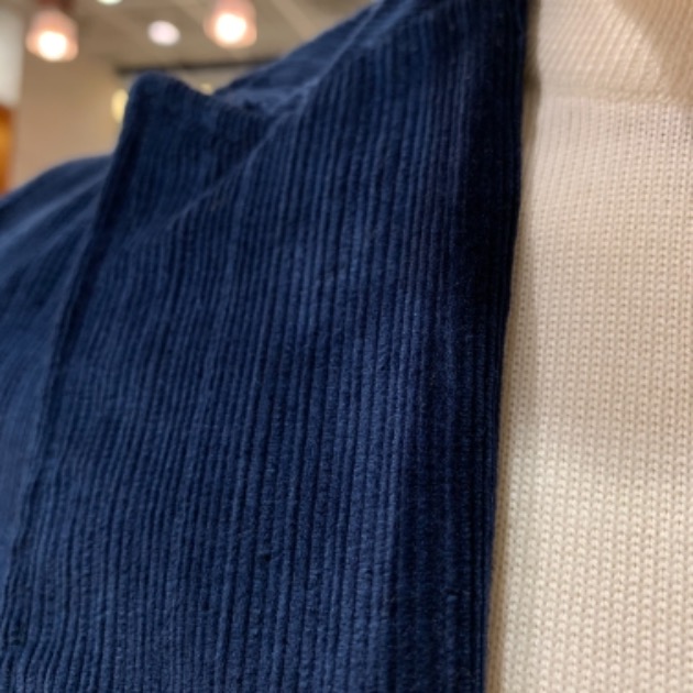 ブルーの発色が良いですね。 非常に都会的な雰囲気のコーデュロイジャケットです。