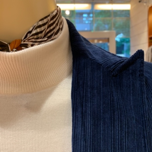 合わせもモダンなイメージで。モックネックにネッカチーフ。毎シーズンご好評頂いている<GRANSASSO>の12ゲージ、入荷していますよ。