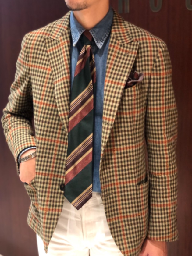 この日は、ガブリエレパジーニのシングルピークドラペルのジャケットをデニムシャツでスポーティにタイドアップ。