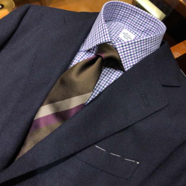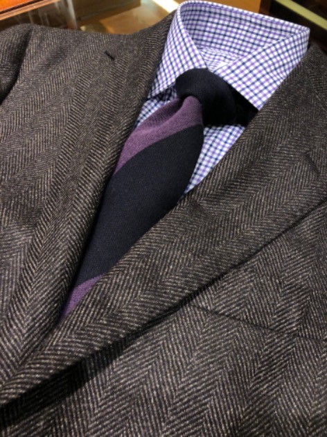 タッターソールのネイビー×パープルの配色と同じストライプタイをあえてもってくるのも嫌いではないです。