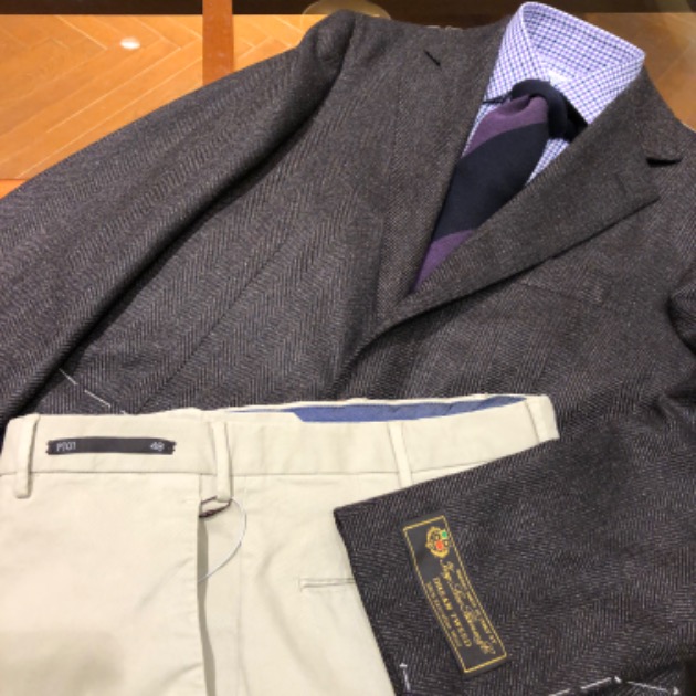 ウールタイにして、ブラウンのジャケットとコットンパンツに。