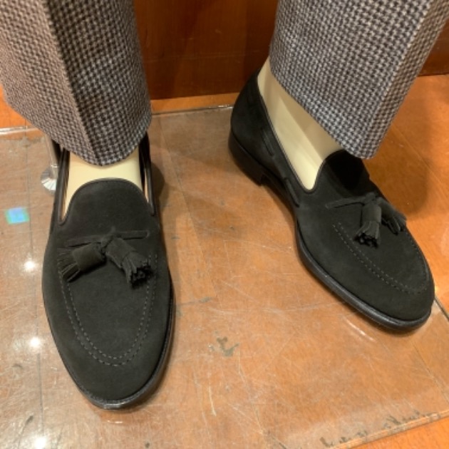 足元は新入荷のこちらを。今シーズン注目のブラックスエード。良いですね。旬な感じもありますし、グレースーツによく合います。