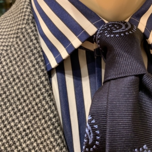 <MARIA SANTANGELO>のネイビーワイドストライプはよく見るとサンドスト。ブラックのラインが入ってます。ネイビーを引き立てつつ、スーツのグレーにもマッチしますね。