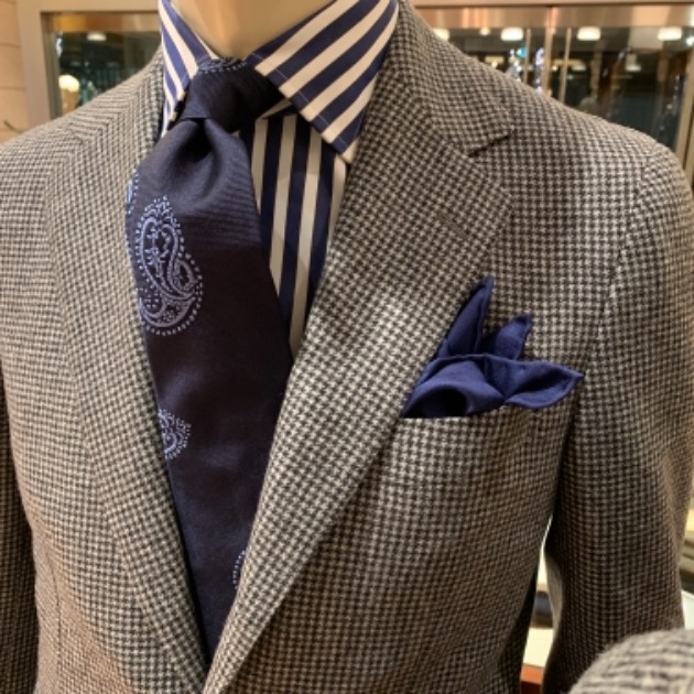 <BEAMS F>のハウンドトゥース柄スーツ。シャツ、タイ、チーフ、全てネイビーで纏めました。グレーにネイビー、好きな配色なんです。都会的というか、知的というか、そんなイメージです。