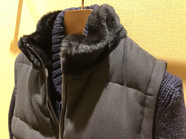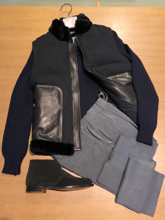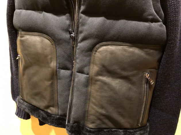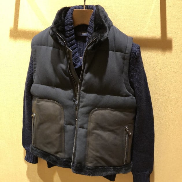 レザーとダウンとジャージー素材のコンビのダウンベストは、EMMETI