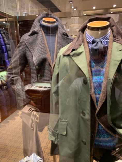 オーダーサロン前のトルソーが変更されてます。今回はスタッフ梶との共作。訳あって、ブリティッシュ(右)とイタリアン(左)みたいな感じに仕上がりました。2体ともコート着用のコーディネート。お陰様で評判も良さそう(?)です。