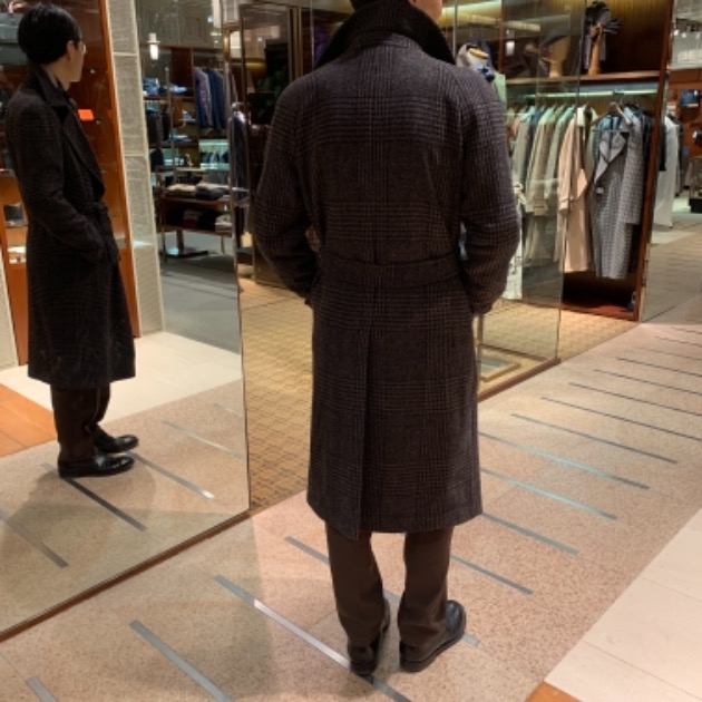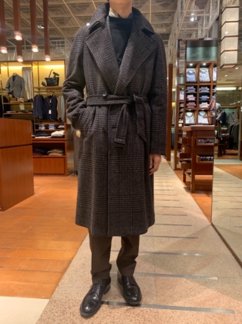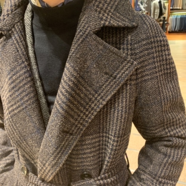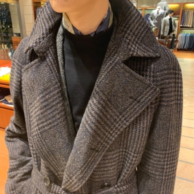 今日はスタッフ畠山に着てもらいました。最近登場頻度が高め?ですね。<TAGLIATORE>の新型モデル"BROCK"です。長い着丈、全体的にゆったりしたフィッティング。コートのトレンドを象徴するようなモデルです。