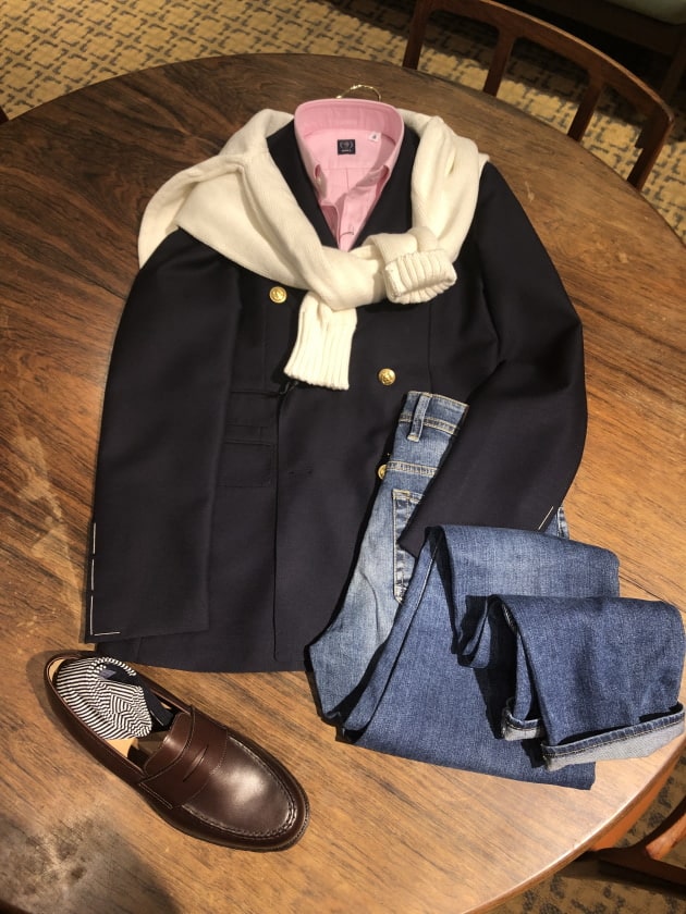 それだけではなんとなく寂しいのでニットを肩掛け。ただ、ポイントはソックスだったり。