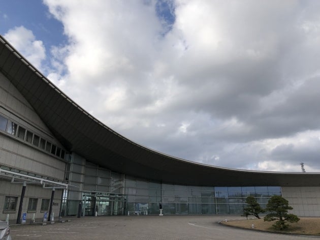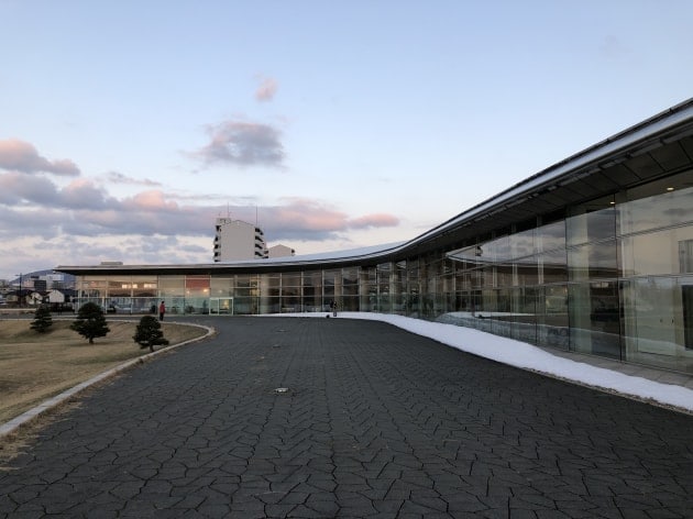 前回は自転車でダッシュで通り過ぎて見る余裕がなかった…会場の松江市にある島根県立美術館は、日本で7番目に大きな湖、宍道湖(しんじこ)に面した、横長の美しい美術館でした。