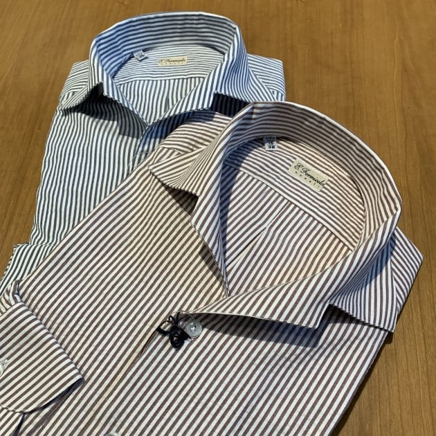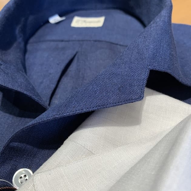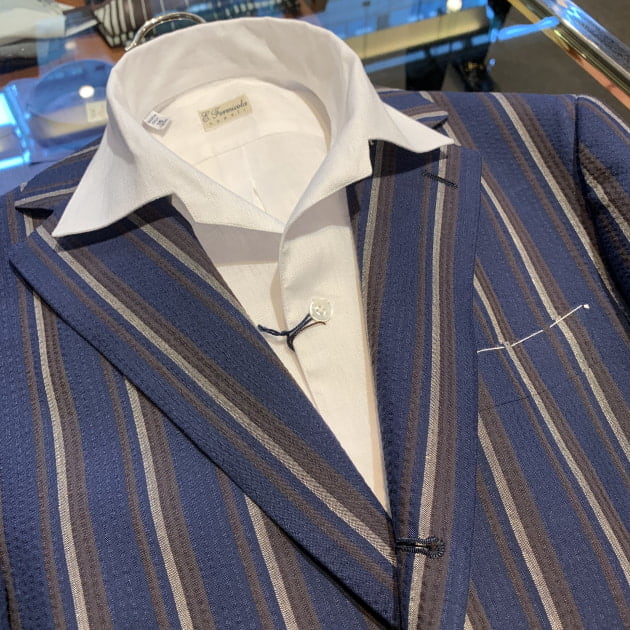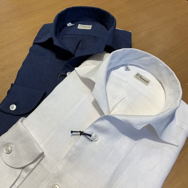 個人的には春夏シーズンもタイドアップしていることが多いので(お店では)、オープンカラーはあまり着ませんが<ERRICO FORMICOLA>のこのモデルは好きですね。特に、ジャケットのインナーにオープンカラーをイメージされているお客様には、おすすめです。