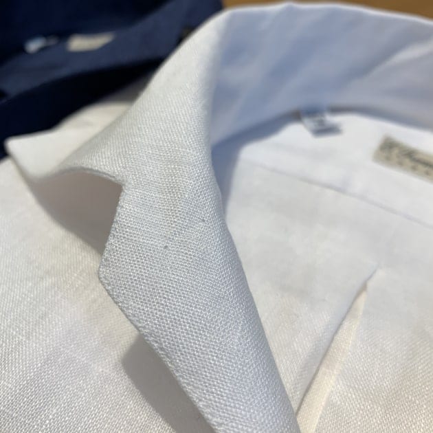 台襟と襟羽が1続きのワンピースカラー仕様。フワっとした襟のロール感が生まれるディティールです。生地はリネン100%でホワイトと、