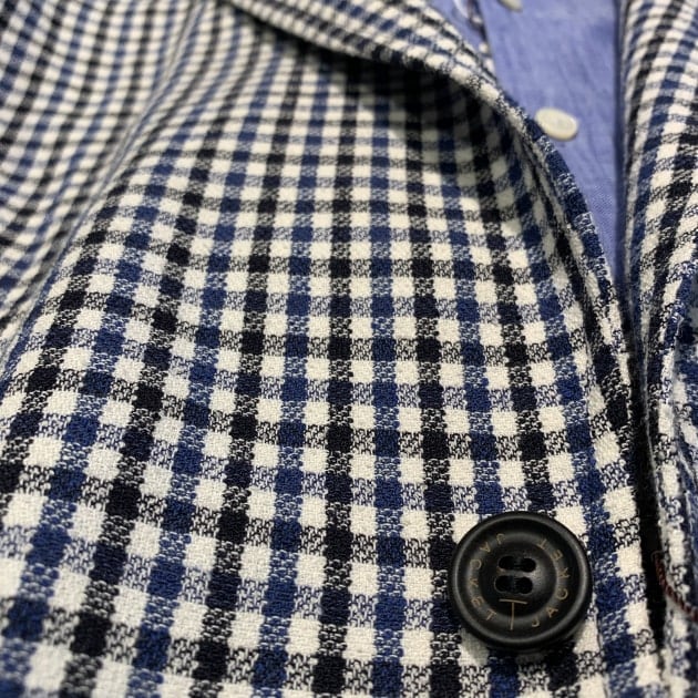 ブルー、ブラック、ホワイトのガンクラブチェック。爽やかです。生地はコットンベースでリネンやナイロンが少し混紡されています。タッチも軽いですね。