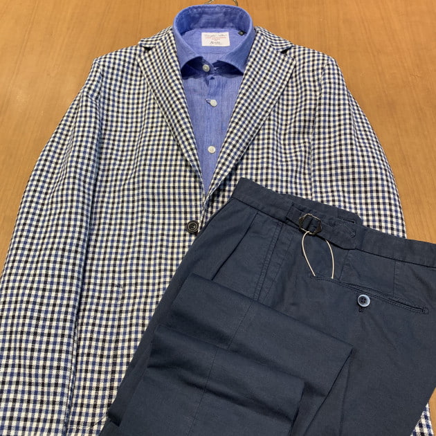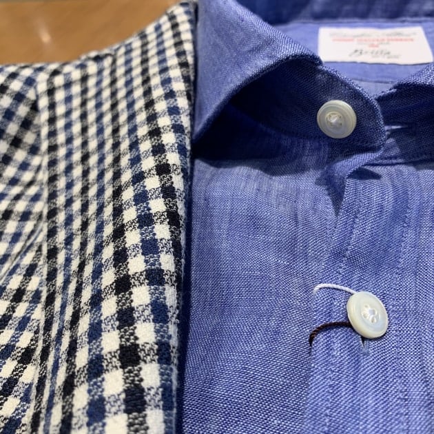 シャツは綺麗なリネンのブルーを合わせてみました。毎年大人気の<Brilla per il gusto>のオリジナルです。今シーズンもラインナップしております。