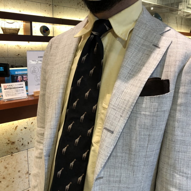 タイは、ベージュかブラウン、ブラックのニットタイが合いそうでしたが、しばらく着用していなかった<JOHN COMFORT>のキリンさんに。