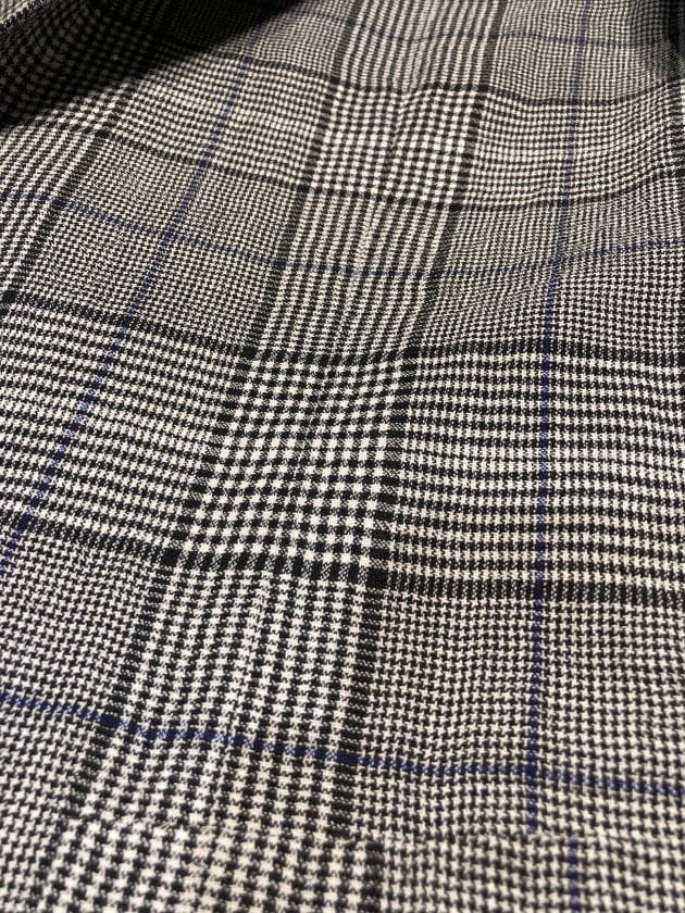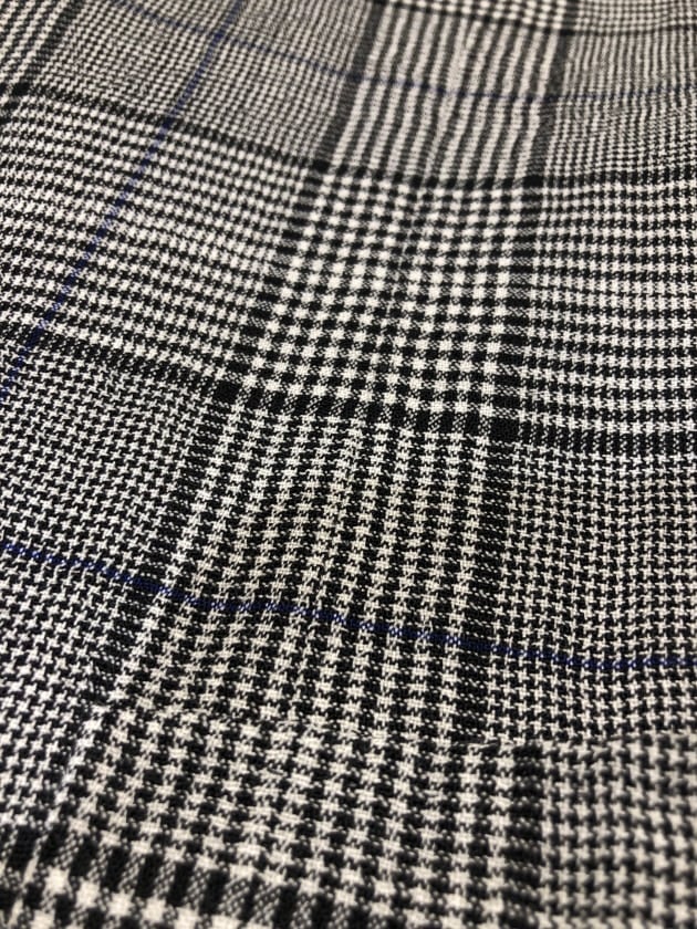 モノトーンベースのグレンチェックに、パープルとダークブルーの中間位の色合いのブルーのオーバーペンが入ります。