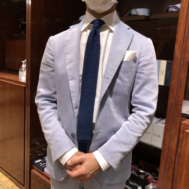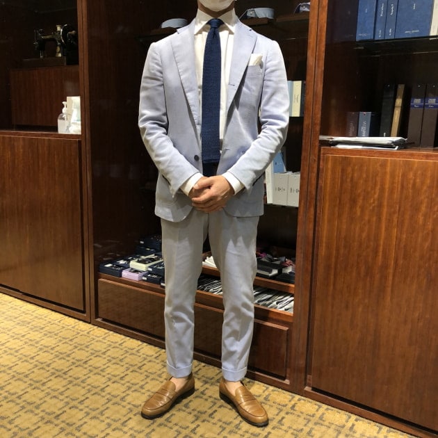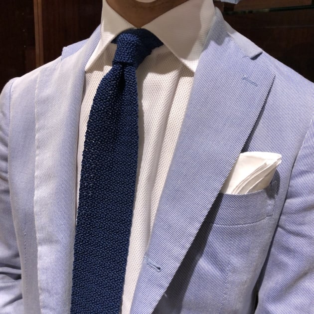 ブルーのコットンスーツを、ダークブルーのニットタイでシンプルにコーディネート。