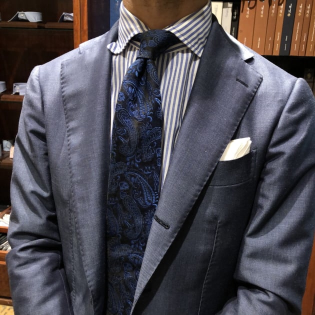 別の日は、モヘア混のスーツでブルーの1トーンコーディネート。