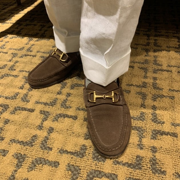 足元はビットローファー。パンツの丈もいつもより少し長めにしたそうです。ハーフクッションくらいですね。裾幅もそれなりにあるので、良いバランスですね。