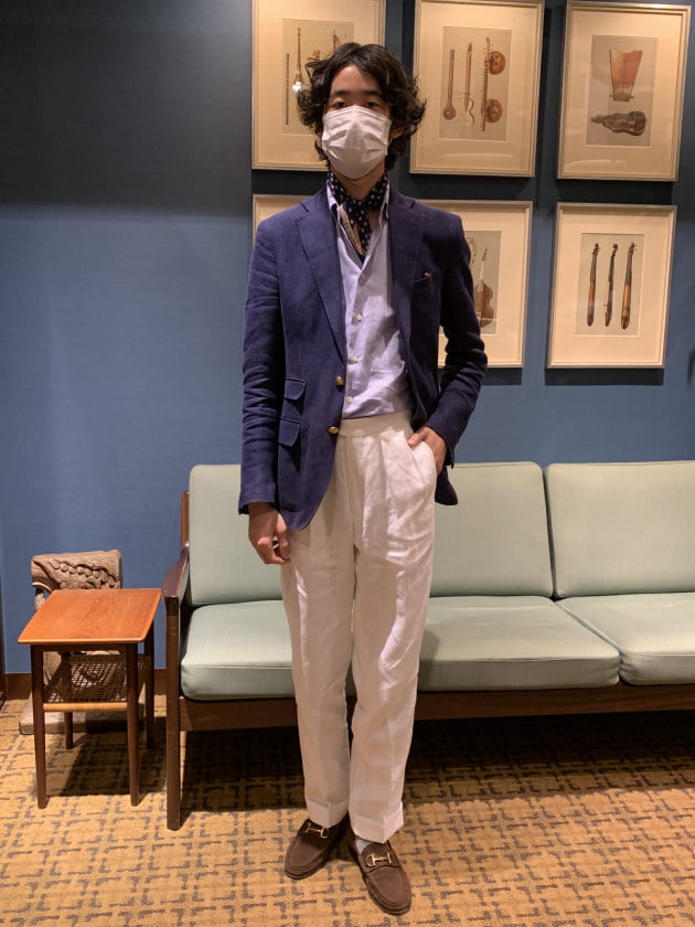 マスク着用のリアルコーディネート、スタッフ本寺です。最近ブログの投稿も始めました。そちらも要チェックです。この日はネイビーブレザーにホワイトパンツの爽やかなスタイリング。