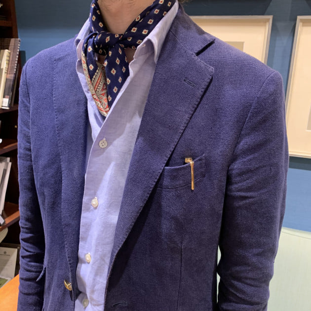 青みが強い金ボタンブレザーは<De Petrillo>のリネン生地。タイドアップではなく、ネッカチーフで軽い着こなしに。ポケットチーフ無しでボールペンを挿している辺りもニクイですね。