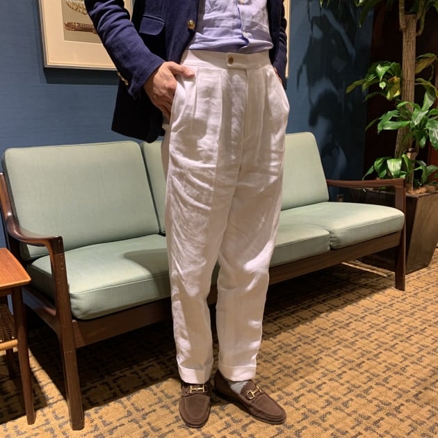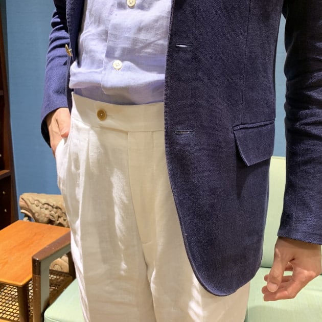 パンツは今シーズンの品物です。<BERNARD ZINS>のワイドシルエットモデルです。打ち込みのしっかりした麻100%生地。カッコいいんですよ、コレ。私も購入を検討しましたが、私の股下寸法ではあまり似合わなかったので断念しました。スタッフ本寺くらい足が長いと、流石に綺麗なシルエットが出ますね。