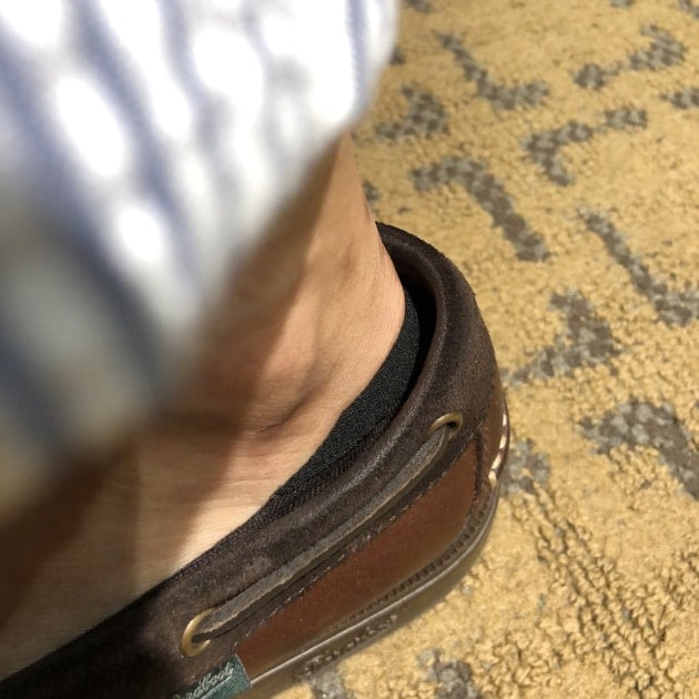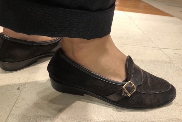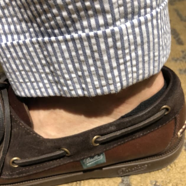 カカトにゆとりのあるパラブーツなので、多めな見え方ですが、他の靴だと見えにくいですね。