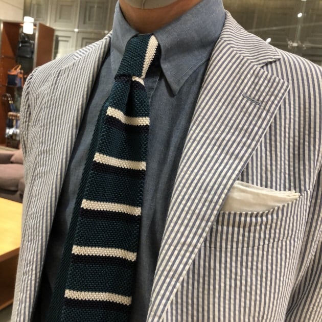 シアサッカーのジャケットに、タブカラーのシャンブレーシャツ、ボーダーのニットタイ。