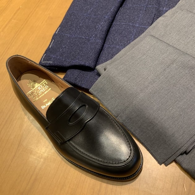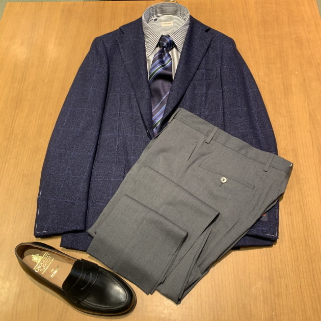 オーソドックスなジャケパンスタイルに。合わせ易いパンツだと思います。ん?ところでこの靴は...。