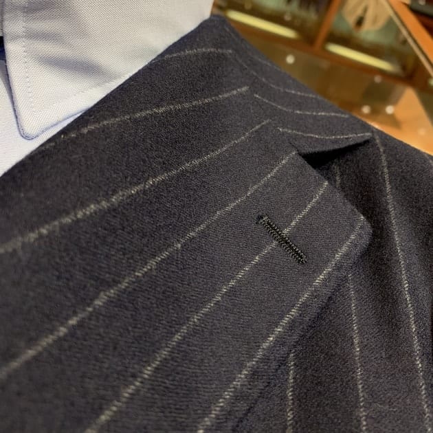 ネイビーの発色はこちらの画像が現物に近いです。ストライプ間隔も特別広くなく、オーソドックスなチョークストライプ。しっかりしたフランネルの質感も良いですね。定番と言えば定番なのですが、トレンドに左右されずカッコいい秋冬スーツ服地だと思います。