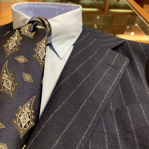 無地のタブカラーシャツに、ネイビーのペイズリージャカードタイを合わせてみました。柄を多用しない、コントラストを付け過ぎないコーディネートが最近はおすすめです。
