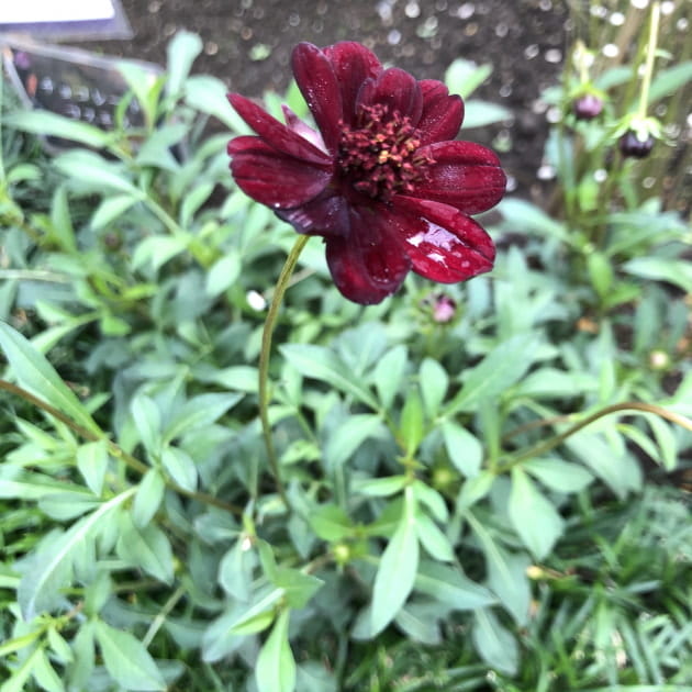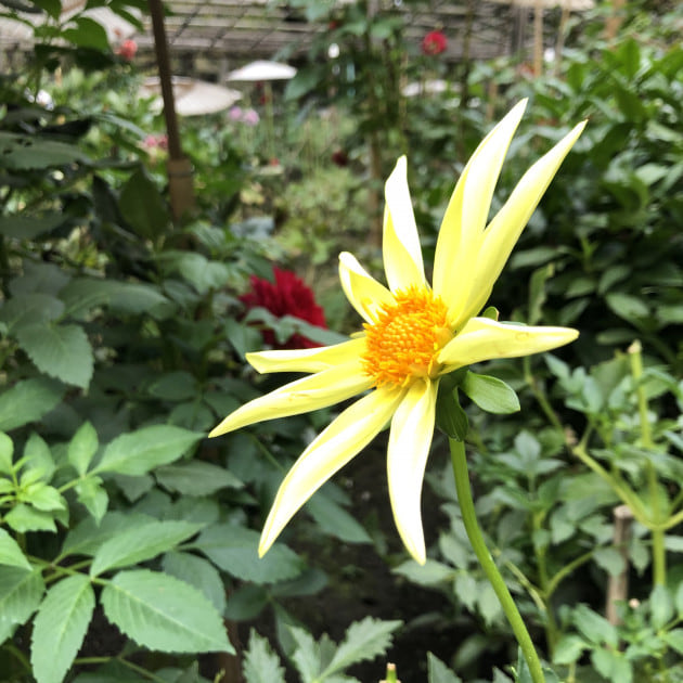 嘘みたいにまん丸なボール咲き。菊みたいなレモンカード。ダリアは菊科なのも納得できます。でも、こんな先細りな種類も