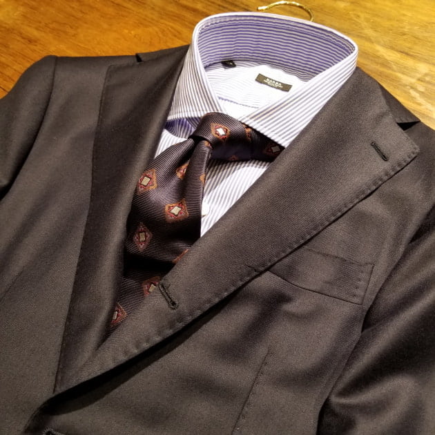 高級生地で無地のベーシックスーツですのでシャツやタイもシンプルなコーディネートにしております。