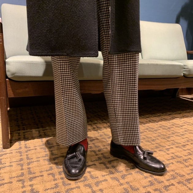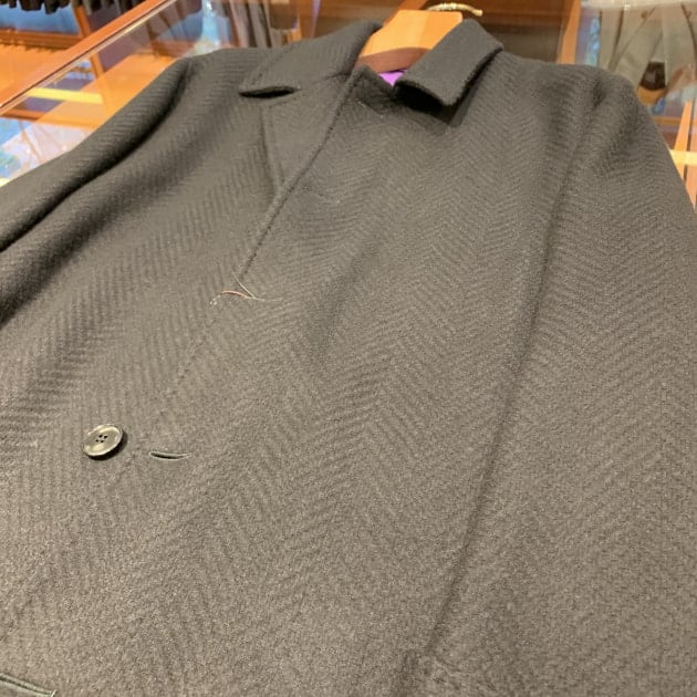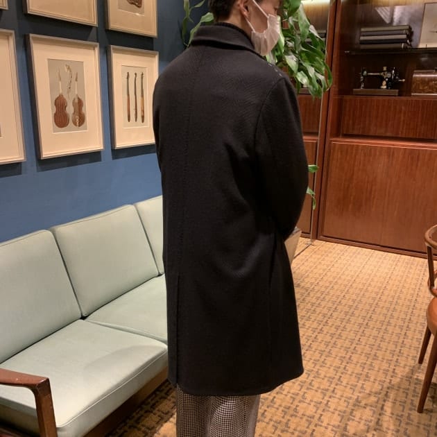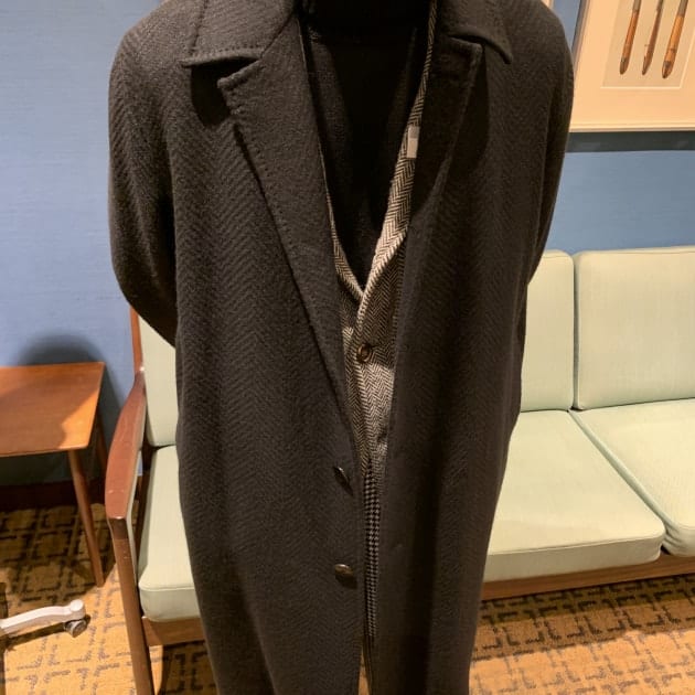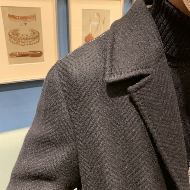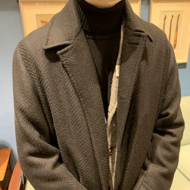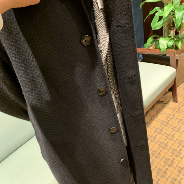 スタッフ阿由葉がサイズ44着用で、サイズ感としては丁度良いと思うのですが、少し肩が落ちるドロップショルダーです。先日のブログでご紹介したジャケットとは別生地ですが、このコートもブラックのヘリンボーン生地。織り柄がしっかり大きめですね。