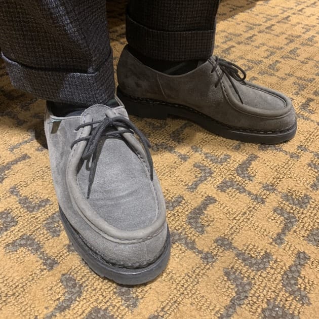<Paraboot>の定番チロリアンシューズMICHAELのグレースエードです。トランクショーで購入してきたそうです。珍しい色だなと思ったのですが、こちらのグレースエードは今シーズンの限定カラーなのだそうで。この手のシューズも昔から履いてますね。何足持っているのでしょうか...。パンツとの相性も良いです。<International Gallery BEAMS>レーベル的というか、モダンな感じがします。W幅4,0cmというのもポイントかもしれませんね。
