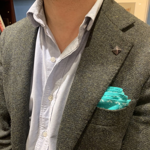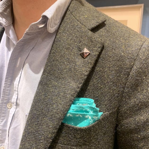 綺麗な発色のチーフがアクセントになっていますね。何処で仕入れてきたのでしょうか。ラペルのフラワーホールに付けた<BUNNEY>のピンも、さり気ない感じで良いです。グリーンとブルーのコンビネーションがポイントだそうです。