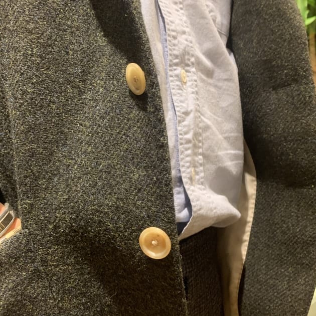 ボタンはベージュ。生地とはっきりコントラストを付けたチョイスです。この辺にもらしさを感じます。好きですよねー、この感じ。この手のジャケット、何着も持ってそうな気がしますが...。余談ですが、スタッフ加藤の健康維持の為、定期的に腹囲測定を行なっています。数値は伏せておきます。