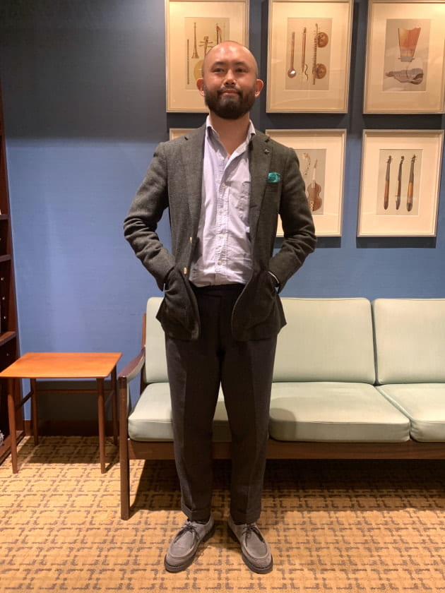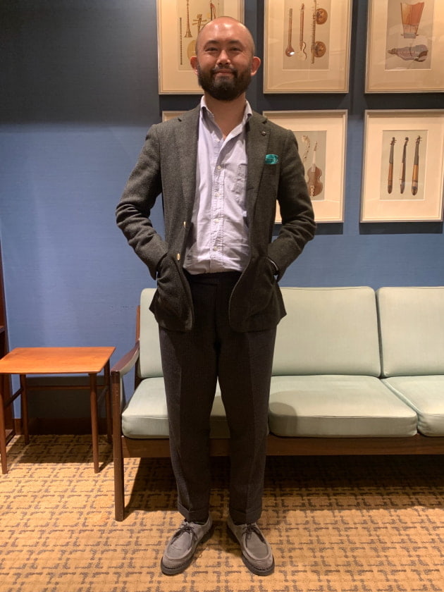 ジャケットはグリーンのツイードです。イギリスMOON社の生地でオーダーしたジャケットです。この色、昔から好きですね。何だか納得できる生地チョイスです。シャツは<Brooks Brothers>のオックスフォードラウンドカラー。ノーネクタイで第2ボタンまで開けた着こなしです。この日ニットタイも持ってきていたようですが、気分的にノータイにしたそうです。