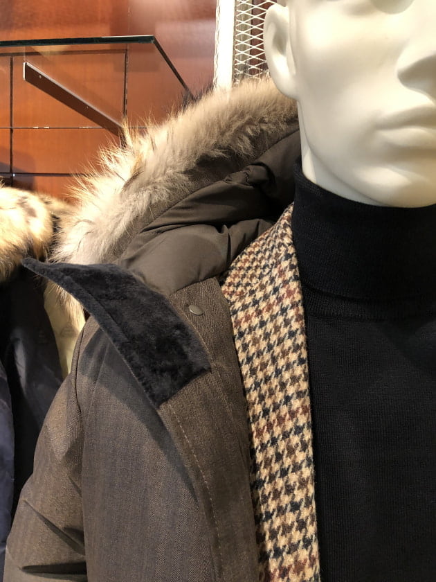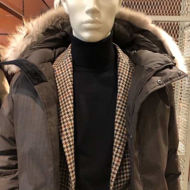 ブラウンとほんのりブラックが混ざったようなヘリンボーン地なので、このディスプレイのようにブラックでシャープにまとめても良い雰囲気です。