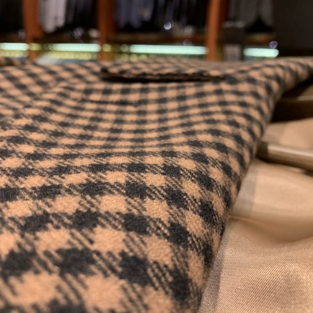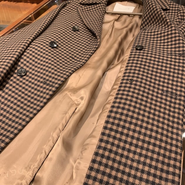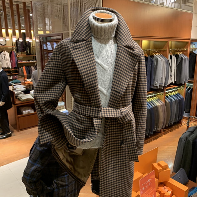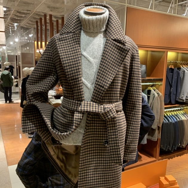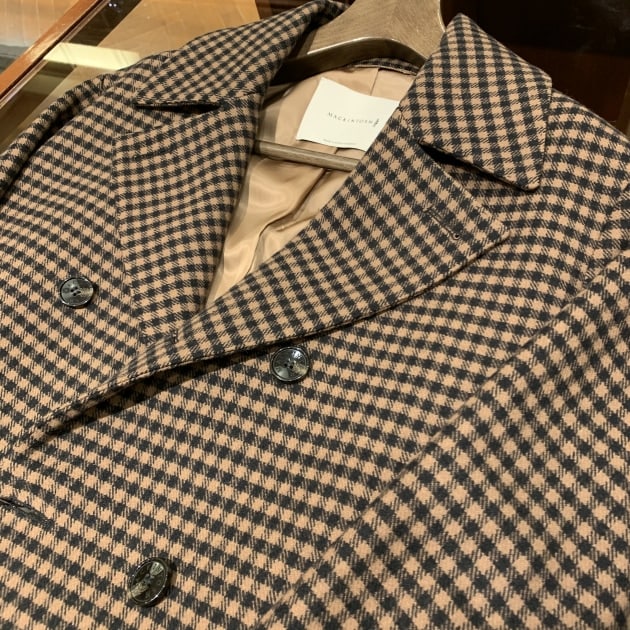 主役の< MACKINTOSH>はDARVELというモデルです。ブラウン×ブラックのチェック柄。色はこちらの1色のみです。比較的柄ピッチも小さめで、モダンでシックな雰囲気のウールコート。英国の伝統的なトレンチコートデザインがベースになっています。